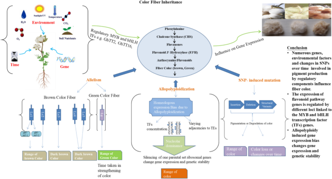 Cotton is a commercially valuable fiber crop, renowned for its unique fiber properties. The distinctive features of cotton fiber result from complex interactions among various genetic and molecular pathways. One intriguing aspect of cotton fiber is its natural color, which offers the potential to develop a diverse spectrum of naturally colored cotton fibers. This review aims to elucidate these complexities by examining the inheritance patterns of different fiber colors. Initially, it was proposed that distinct genes were responsible for the color traits of cotton fiber, such as green, brown, and white, based on Mendelian inheritance patterns. Traditionally, a dominant brown fiber gene was believed to be the primary determinant of brown fiber color. However, recent advancements in cotton genetics have identified numerous genes involved in pigment production, regulatory components influencing fiber color, and genetic variants contributing to the diverse range of fiber colors. Key metabolic pathways have been mapped, revealing genes encoding the corresponding enzymes, such as chalcone synthase (GhCHS), which is linked to the flavonoid production pathway and associated with brown and green fiber coloration. Proanthocyanidins and their derivatives, produced via the flavonoid pathway, are the primary pigments in brown fiber. The expression of flavonoid pathway genes is regulated by a major locus Lc1 linked to the MYB transcription factor gene TRANSPARENT TESTA 2 (GhTT2). Brown and green fiber colors are partially dominant traits controlled by single genes, suggesting that gene expression dosage impacts the phenotype of colored cotton. The review highlights the crucial role of genetic and epigenetic processes in determining fiber color. Additionally, it nuanced interaction between dominant brown and white fiber genes and the involvement of multiple loci or modifier genes influencing color intensity.
