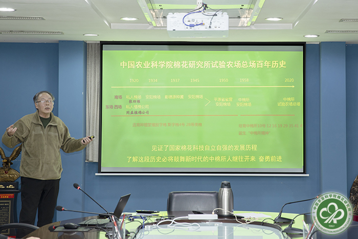 党委办公室主任宋晓轩以“百年棉业改良的见证——中国农业科学院棉花研究所试验农场总场沿革”为题讲党课。他结合史料详实地讲解了中棉所南场、东场及西场的从1920年建立到2020年发展至今的百年历史沿革,见证了国家棉花科技自立自强的发展历程,并结合谭联望、张方域、黄祯茂和蔡荣芳等四位国家一等奖第一完成人的工作和生活经历,阐释了“艰苦奋斗、甘于奉献、勤于实践、勇于创新”的“中棉所精神”的深刻内涵,勉励支部党员继往开来、奋勇前进。
