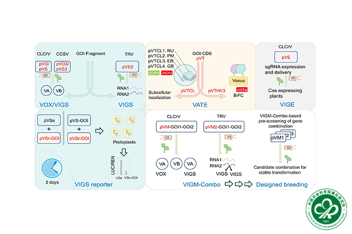 该研究首次提出了一种“一体化的双组分病毒使用策略”,可以简化双组分病毒载体的使用,成功将基于棉花叶皱缩病毒和烟草脆裂病毒的常用病毒诱导的基因沉默(VIGS)系统改造为一体化系统VS和VS2。两种一体化VIGS系统侵染植物后表现出与原始系统类似甚至更好的基因沉默效果。同时,该研究在一体化的VIGS质粒pVS基础上,创制了一套标准化的植物病毒载体工具盒,用于VIGS、病毒介导的过表达(VOX)、病毒辅助的瞬时表达(VATE)和病毒介导的基因组编辑(VIGE)等。该研究创新性的开发了一种VIGS报告系统质粒pVSr,用于在原生质体中快速检测VIGS效率,并且还提出了两种病毒介导的基因操纵组合(VIGM-Combo)策略进行多基因的表达操纵,助力分子设计育种研究。此外,该研究在棉花的近源种红麻、洛神花和蜀葵中展示了如何利用基因序列同源性快速在近缘物种中测试并建立病毒递送技术体系。结果表明,一体化植物病毒载体工具盒不仅为病毒载体的简化使用和开发提供了标准化方案,也为未来高通量病毒递送技术的发展应用提供了技术支撑。