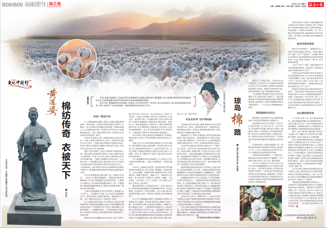 “布业始祖”黄道婆在崖州学会运用制棉工具,创新传承“衣被天下”;海岛蓬蓬棉成为拓宽陆地棉遗传基础的重要种质资源;国家种质三亚野生棉圃里的棉花“基因密码”……千百年来,海南棉路灿烂绽放。