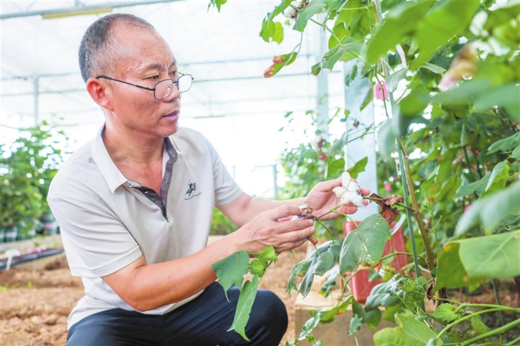 在国家野生棉种质资源圃(三亚野生棉种质圃)内,中国农业科学院棉花研究所的科研人员刘方正在大棚内仔细察看野生棉材料的生长情况(刘琪成 摄)