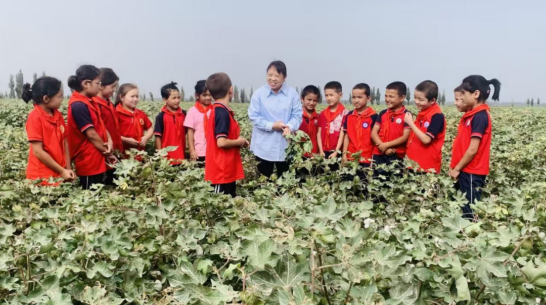 2024年8月,宋美珍(中)为喀什莎车县巴格阿瓦乡团结村小学学生讲解棉花知识