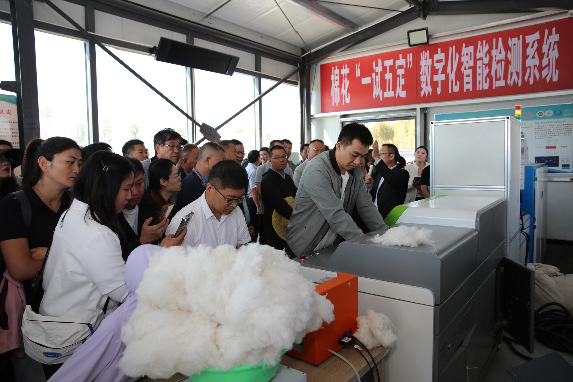 在观摩会期间,与会代表实地观摩了中棉所158田间表现,了解其栽培技术要点。会议还展示了石河子大学研发的棉花“一试五定”,即包含棉花纤维长度、比强度、衣分率、马克隆值、回潮率、含杂率等智能检测与质量追溯技术装备、棉花在线检测与数字化加工技术装备等科技成果,并运用该设备现场对中棉所158的手采棉样进行检测分析,结果显示其纤维长度31毫米、回潮率6.9%、含杂率2.3%等。这一系列从田间到工厂的实地展示,体现棉花产业从品种选育、田间管理到质量追溯的全链条创新思路,为产业提质增效和可持续发展提供系统解决方案。