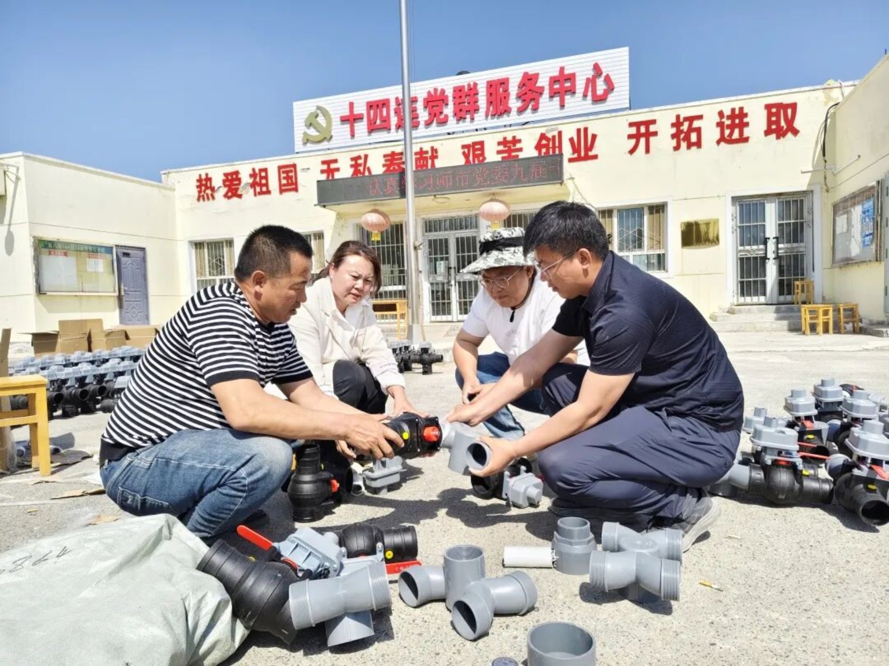 4月10日,在一四四团14连职工鞠周民的150亩棉田里,中国农业科学院棉花研究所棉花智慧栽培创新团队专家与连队“两委”成员蹲在田间,熟练地将智能球阀与滴灌带接口精准对接,拧螺丝、缠胶带一气呵成,一个个小巧的“智慧装置”陆续“上岗”。看着安装好的智能球阀,鞠周民脸上洋溢着喜悦。