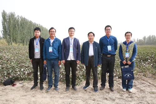 喻树迅院士(右3)在无膜棉示范田合影留念