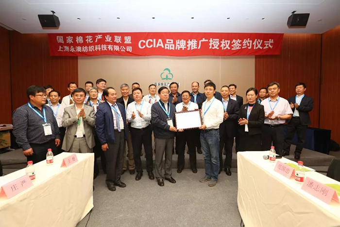 会议中场,由国家棉花产业联盟与上海永澳纺织科技有限公司共同签署了《CCIA品牌推广合作协议》,双方握手联欢,见证了“CCIA”阶段性的重要时刻,随后为“CCIA品牌推广与展示中心”揭牌并颁发授权证书。