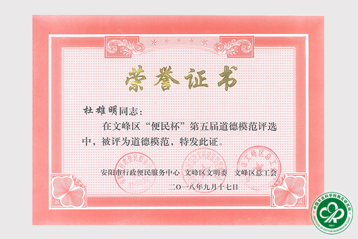 为集中展示公民道德建设的丰硕成果,切实发挥道德模范建设中的示范引领作用,2018年10月17日,安阳市行政便民服务中心和文峰区文明委、总工会联合组织召开了文峰区“便民杯”第五届道德模范评选表彰会议。会上传来喜讯,我所杜雄明研究员荣获文峰区“便民杯”第五届道德模范荣誉称号。