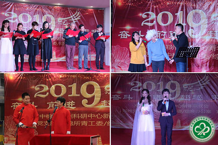 联欢会在中心管理服务团队带来的“改革开放40年赞歌”的诗歌朗诵中正式开始,各种节目轮番登场,一曲高亢洒脱的歌曲《沙漠骆驼》让全场沸腾起来,现场群情激昂,掌声雷动;转基因科研团队全员齐上阵,自导自演大型话剧《疯狂实验室》为观众们带来了实验室里小故事;吉他串烧《时光序曲》及歌曲、贯口、脱口秀、拉丁舞等也让现场观众发出一阵阵欢呼声;令观众开怀大笑的《搞笑三句半》以及集现实与艺术于一身的相声表演《谈棉花》,令人耳目一新,富有美好寓意。晚会中间还穿插举行了抽奖以及游戏互动,使晚会高潮迭起,处处洋溢着喜庆,笑声遍布了会场每个角落。伴随着优美的交际舞表演,联欢会画上了完美的句号。
