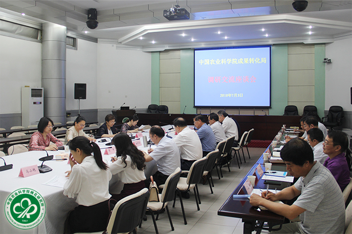 2019年7月3日,中国农业科学院成果转化局副局长冯艳秋、刘洁等一行4人来所就成果转化工作做法、经验和需求,以及重构转化体系的想法和建议进行调研交流。所长李付广、党委书记潘燕荣、副所长张西岭、各职能部门负责人及创新团队专家20余人参加座谈交流。会议由潘燕荣主持。