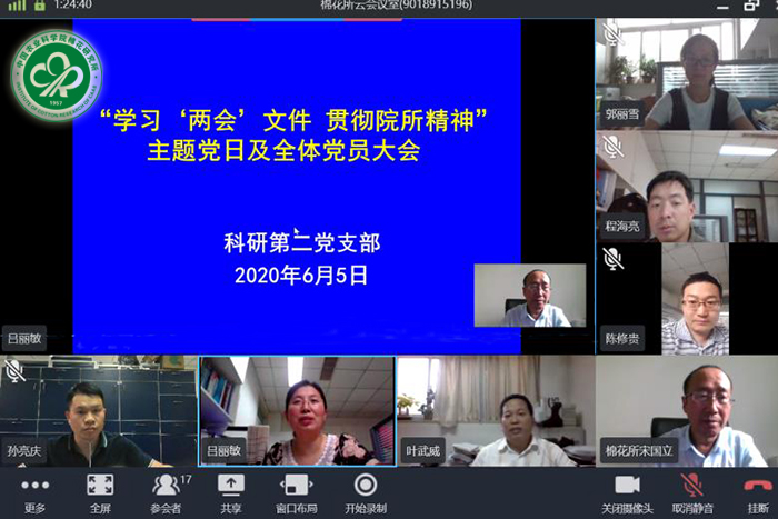 2020年6月5日,中国农业科学院棉花研究所科研第二党支部召开全体党员大会,开展学习贯彻两会和院所领导讲话精神主题党日活动。党委副书记、纪委书记宋国立参加会议。支部书记叶武威主持会议。